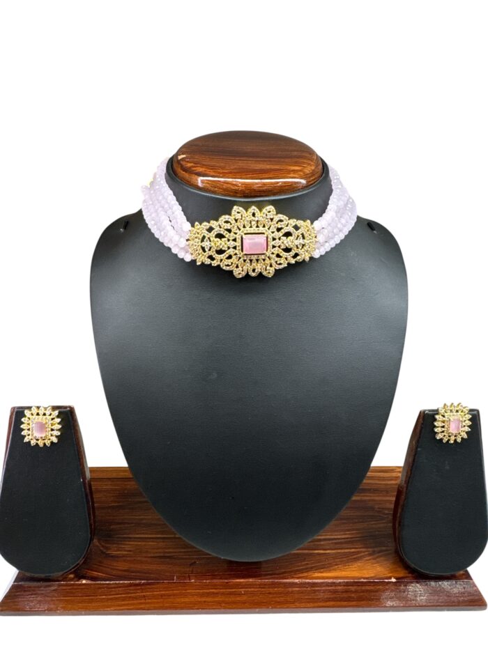 Baby pink necklace set with delicate small stone work, paired with beautiful stud earrings for an elegant finish.