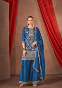 An elegant blue flared kameez with gold embroidary & sequence work. Comes with matching heavy dupatta & pants.
