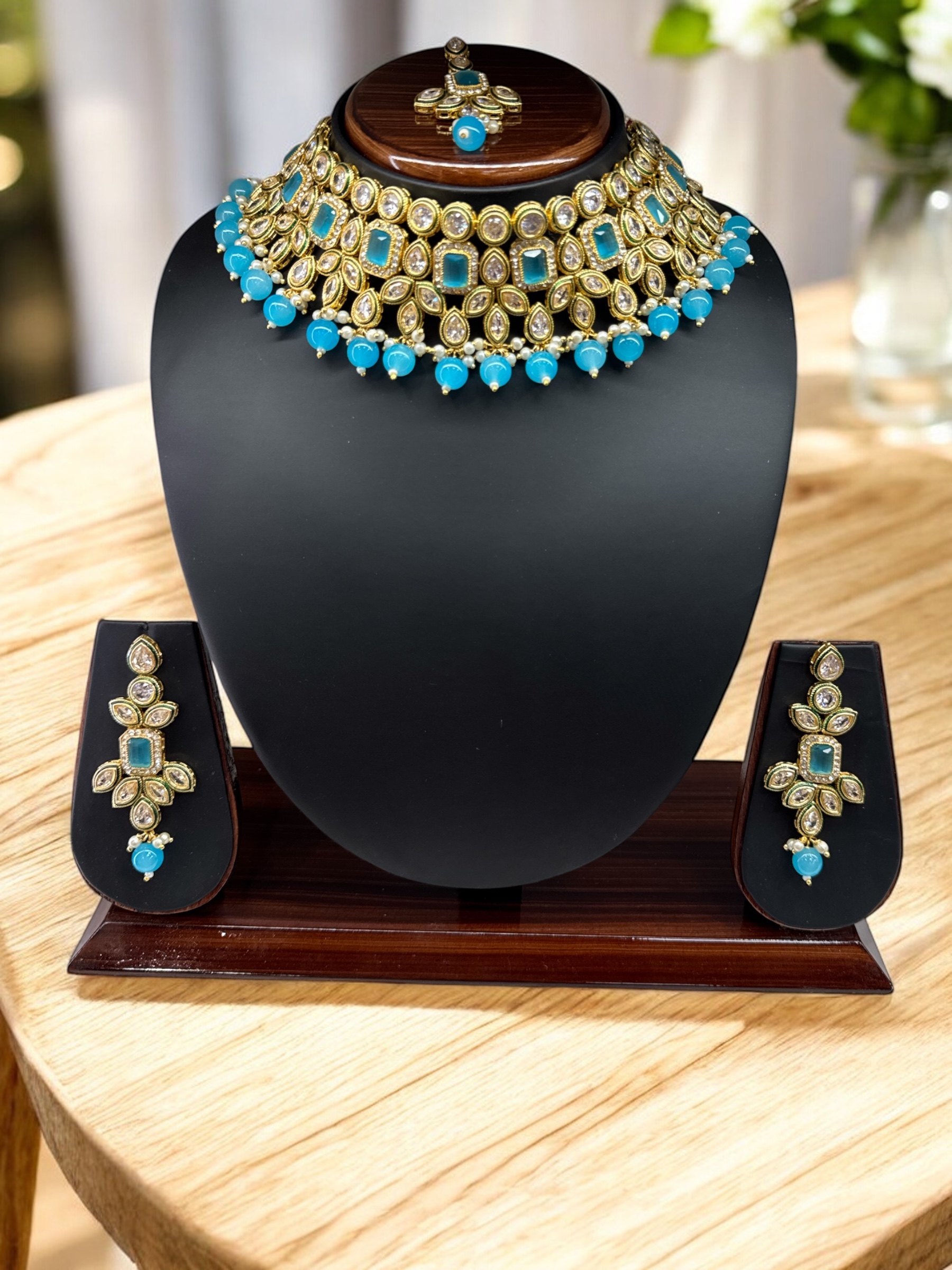 Light blue necklace set with intricate stone and pearl work, includes matching earrings and maang tikka — perfect for weddings and festive occasions.