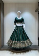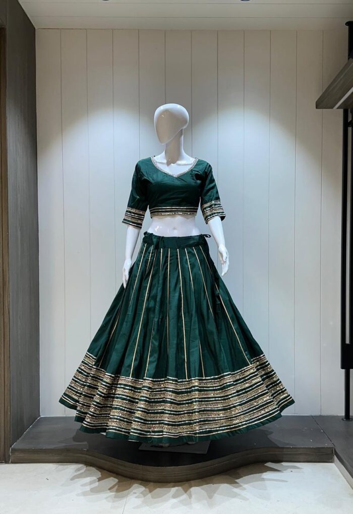Bottle green soft silk Navratri lehenga choli with a contrasting maroon chiffon dupatta, featuring sequins and gold embroidery for a festive and elegant appearance.