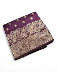 This saree features a delicate floral pattern intricately woven into luxurious silk fabric, offering a touch of grace and sophistication.