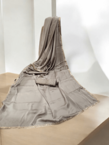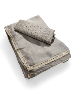 Premium crape chiffon, renowned for its delicate texture and graceful flow. This lightweight fabric ensures a comfortable fit and a fluid, elegant drape.