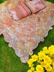 Premium crape chiffon, renowned for its delicate texture and graceful flow. This lightweight fabric ensures a comfortable fit and a fluid, elegant drape.