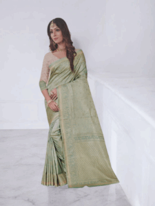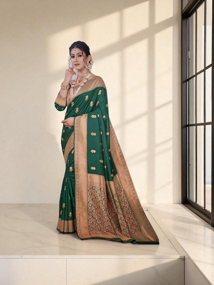 Woven from luxurious soft silk, this saree features a deep, rich green shade that exudes sophistication.