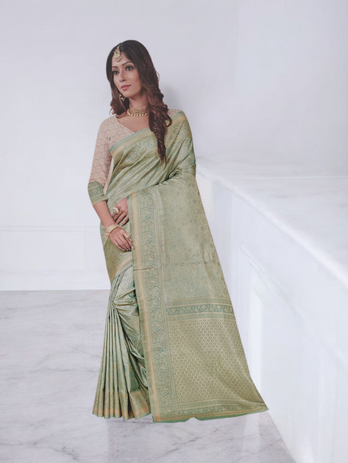 Woven from luxurious soft silk, this saree features a deep, enchanting green shade that adds depth and sophistication to your traditional wardrobe. Ideal for weddings, festivals, and special occasions. Includes a matching blouse piece to complete your timeless look.
