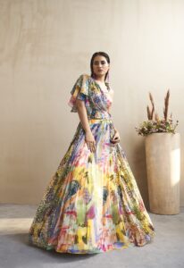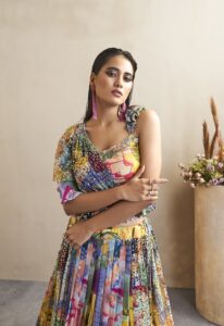 Work Style: One shoulder poncho with multi-colored print and sequin details