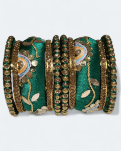 These bangles feature intricately designed double circles adorned with sparkling mirror work, reflecting light beautifully with every move.