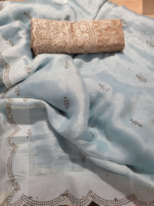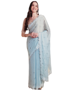 Presenting nayra cut suit with sequnce embroidery work with v-neckline. It is paired up with Flaired Palazzo Pant with an elastic waist and a matching dupatta.
