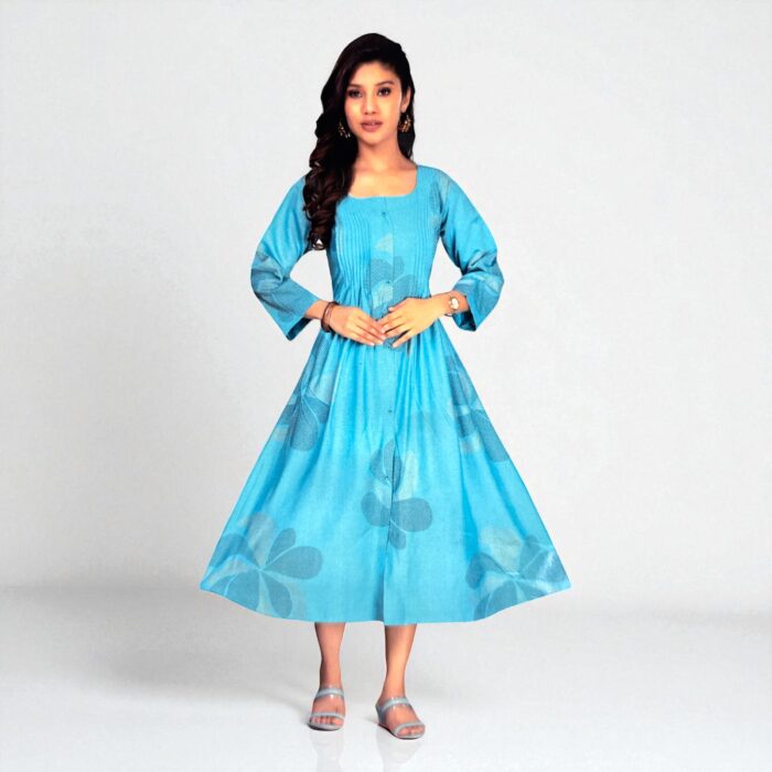 Made from breathable soft cotton in a refreshing light-blue shade, this flared kurti features a 3/4 sleeves, highlighted with delicate floral prints for an elegant yet effortless look.