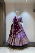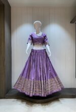 Light purple soft silk Navratri lehenga choli with a contrasting wine chiffon dupatta, featuring sequins and gold embroidery for a festive and elegant appearance.