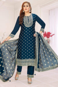 Presenting nayra cut suit with sequnce gold embroidery work with round neckline. It is paired up with Flaired Palazzo Pant with an elastic waist and a matching dupatta.