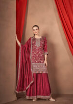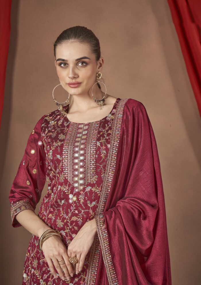 Maroon-maroon soft silk short top with matching plazo and dupatta, beautifully adorned with multicolor embroidery and sequin work. A stylish and elegant festive ensemble.