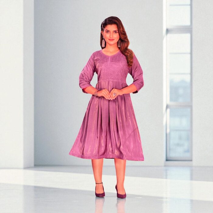 Elegant mauve kurti crafted from soft silk, adorned with delicate self-embroidery and finished with graceful 3/4 sleeves.
