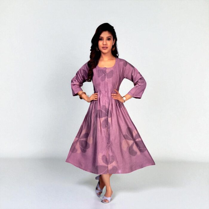 Made from breathable soft cotton in a refreshing mauve shade, this flared kurti features a 3/4 sleeves, highlighted with delicate floral prints for an elegant yet effortless look.