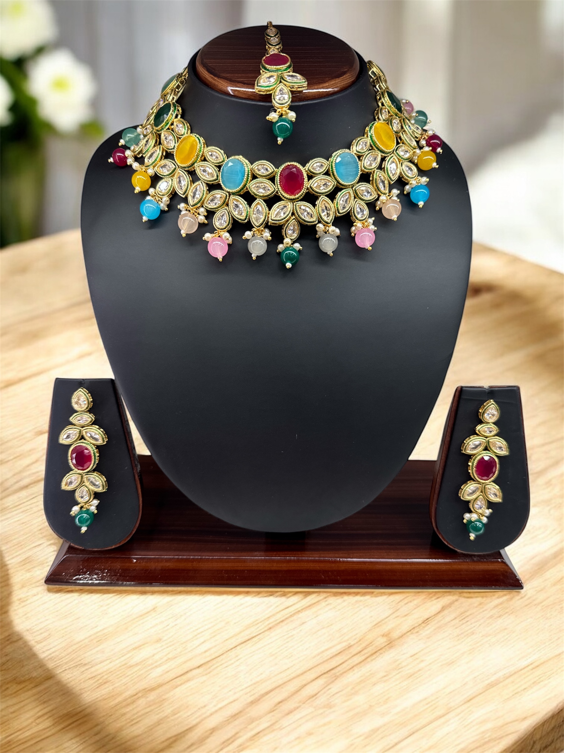 Multi-color necklace set with intricate stone and pearl work, includes matching earrings and maang tikka — perfect for weddings and festive occasions.
