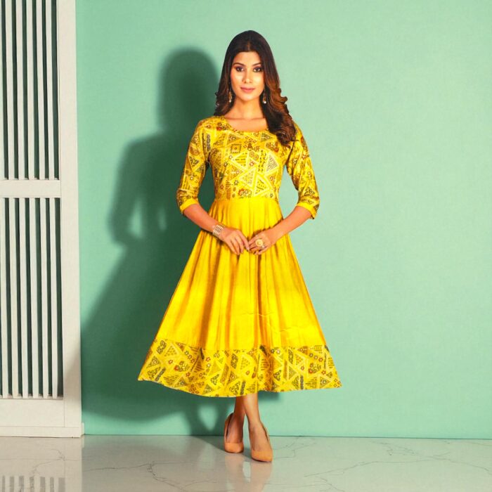This mustard-colored kurti is crafted from luxurious soft silk fabric, featuring beautiful printed work that adds a vibrant and elegant touch, complemented perfectly by its comfortable and stylish 3/4 sleeves.