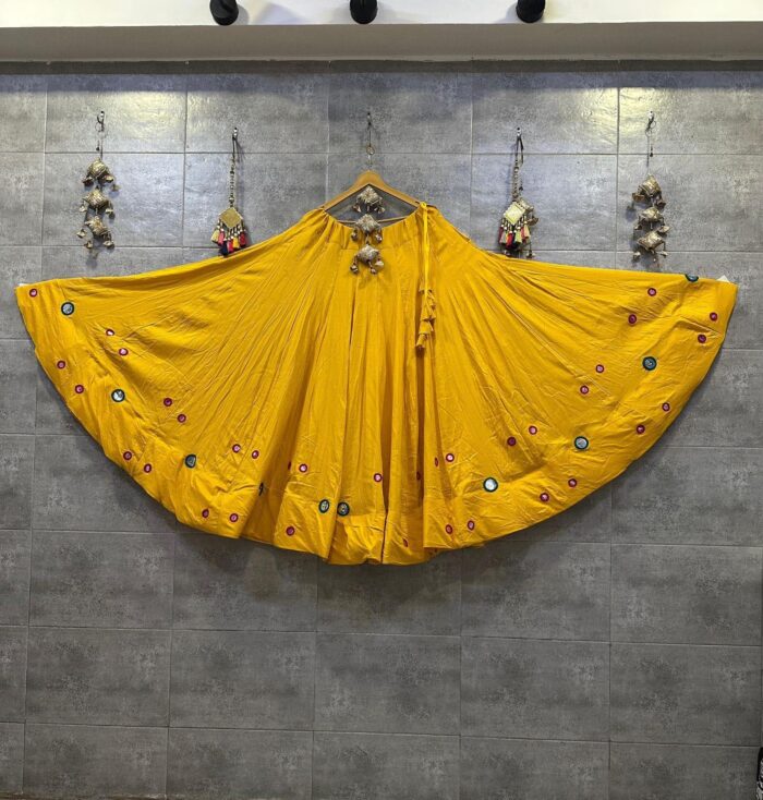 Mustard soft cotton skirt with elegant foil mirror and embroidery work along the bottom, adding a subtle festive touch to this comfortable piece.
