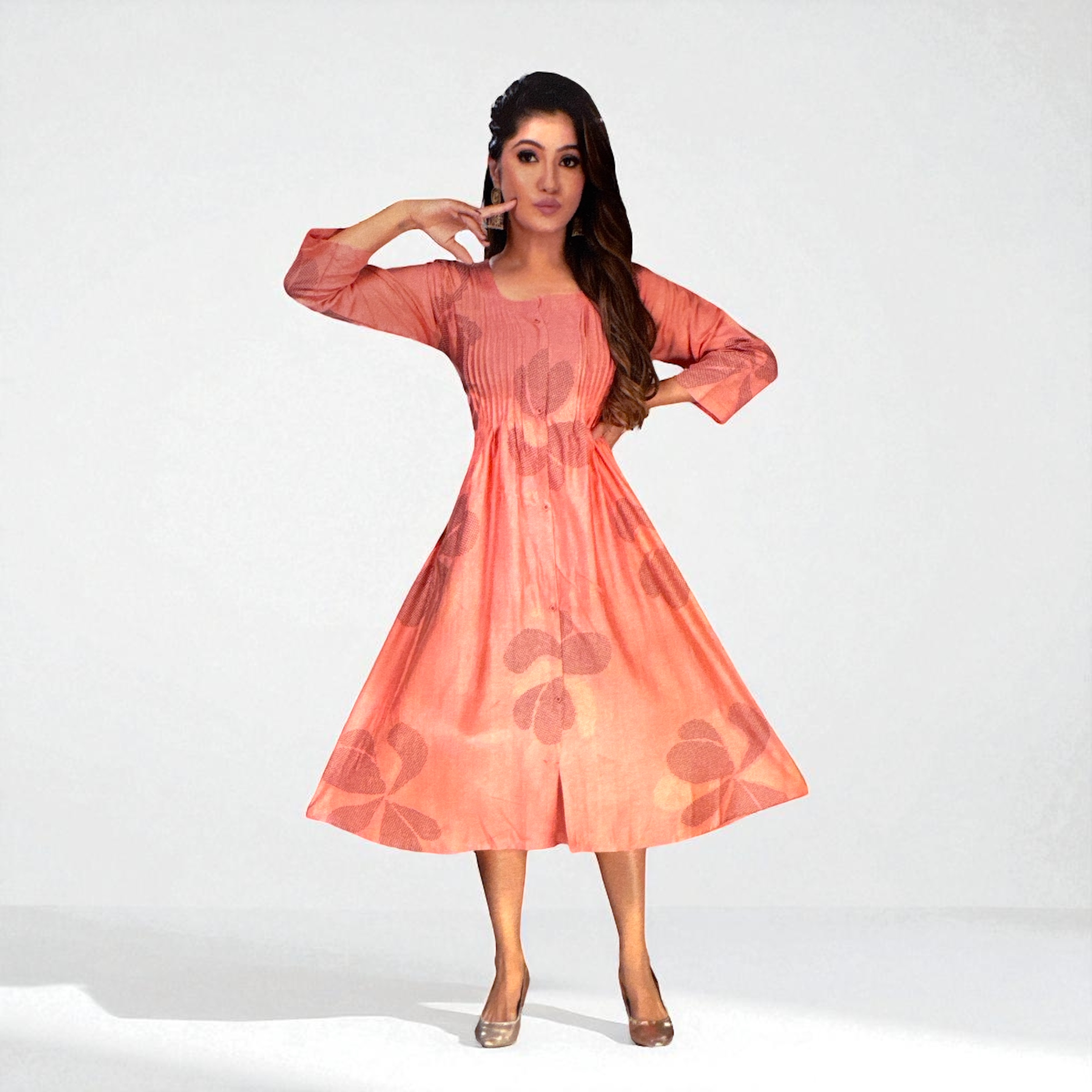 Made from breathable soft cotton in a refreshing peach shade, this flared kurti features a 3/4 sleeves, highlighted with delicate floral prints for an elegant yet effortless look.