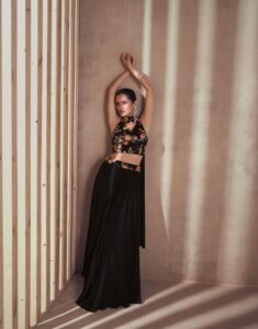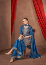 Peacock blue soft silk short top with matching plazo and dupatta, beautifully adorned with multicolor embroidery and sequin work. A stylish and elegant festive ensemble.