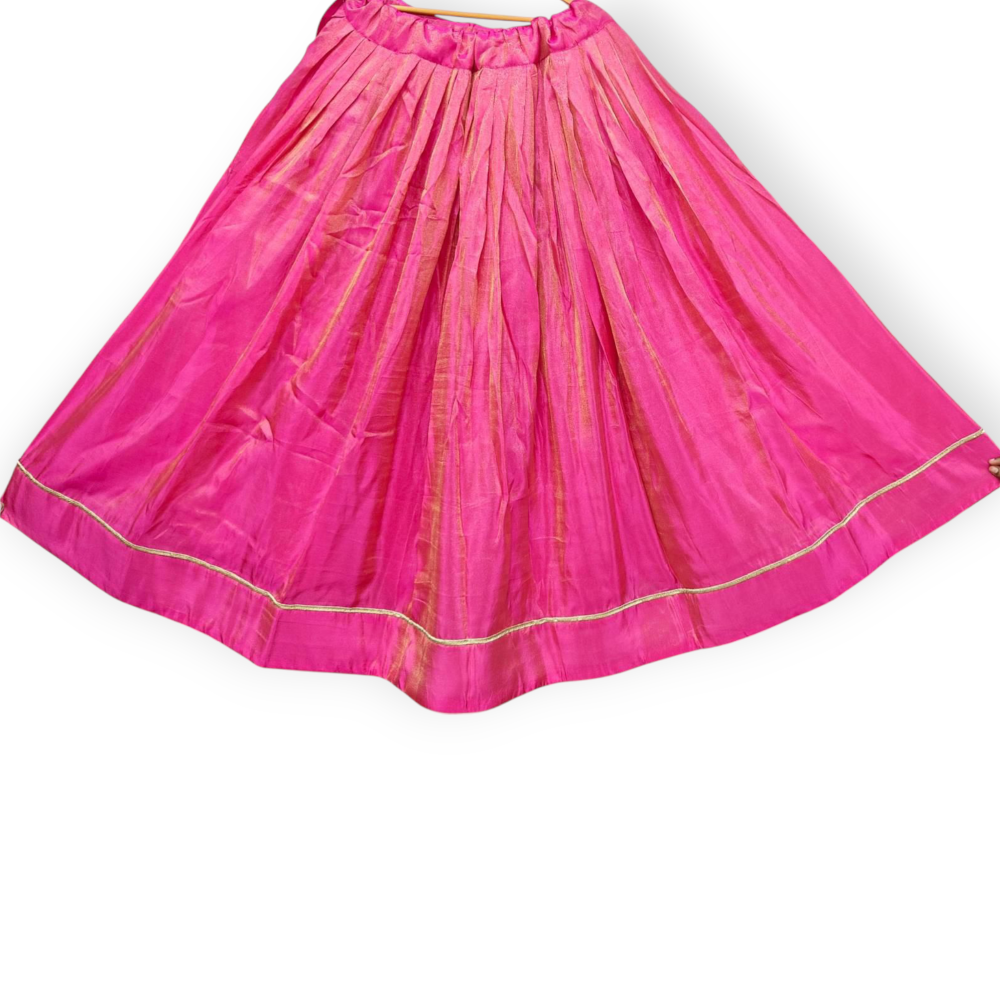 A vibrant pink skirt crafted from soft shimmer fabric, designed with a full flare for graceful movement and an eye-catching finish.
