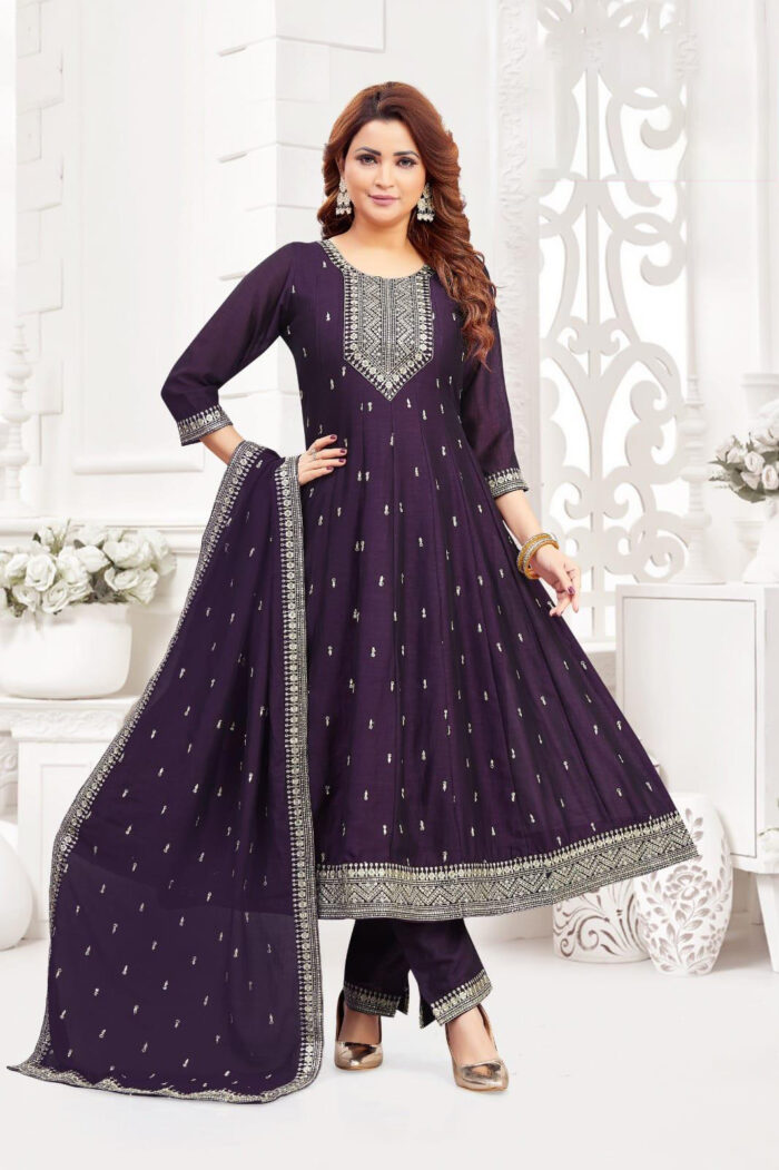 Purple flared churidar with 3/4 sleeves, adorned with gold sequin and embroidery work. Comes with straight pants featuring border detailing and a heavy matching dupatta for a regal look.
