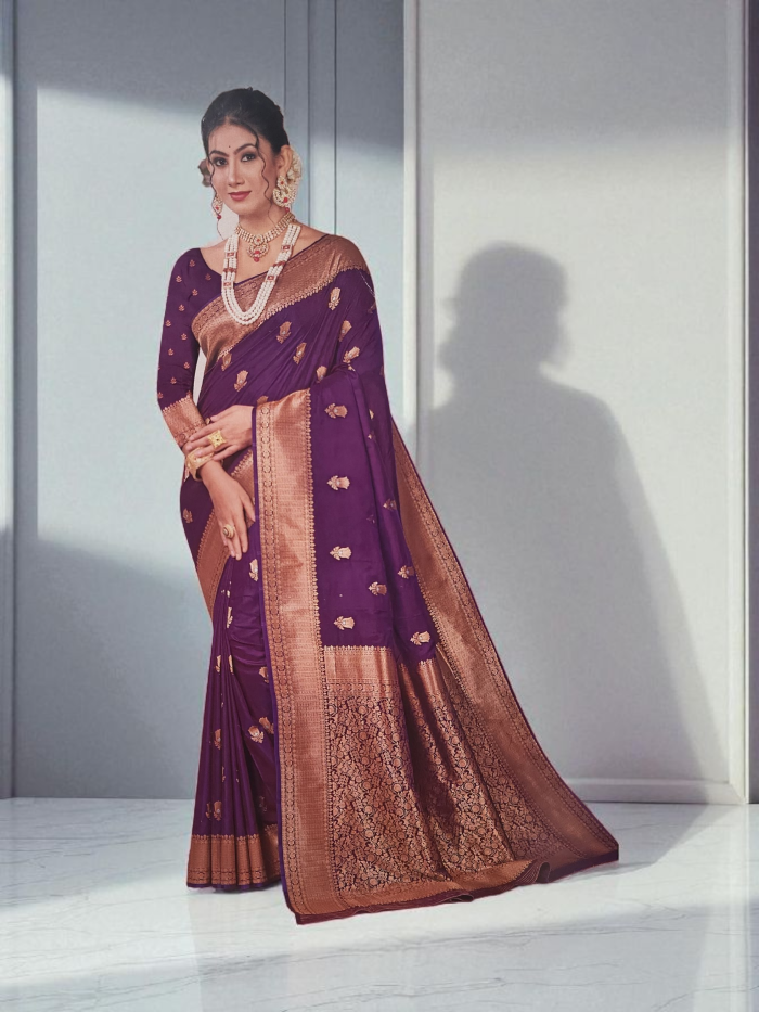 Crafted from smooth, premium soft silk, this saree drapes beautifully and feels luxuriously soft. The rich purple color adds a royal touch, making it perfect for weddings, parties, and special occasions.