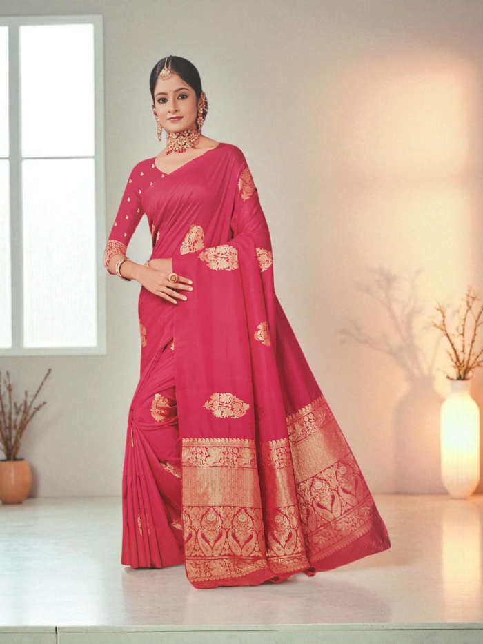 Crafted from premium soft silk, this saree features a vibrant rani pink color that adds charm and elegance to your look.