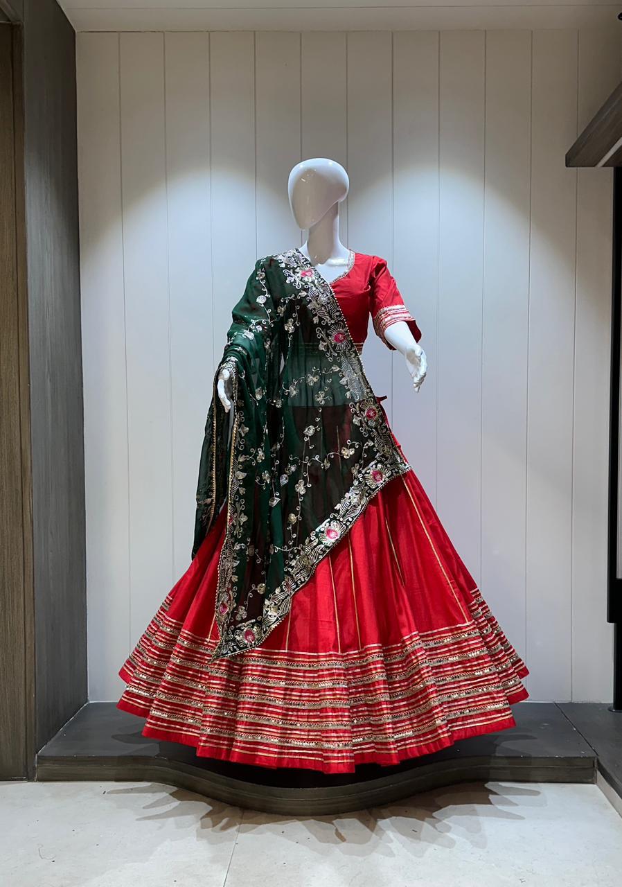 Red soft silk Navratri lehenga choli paired with a contrasting green chiffon dupatta, adorned with sequins and gold embroidery for a festive and elegant look.