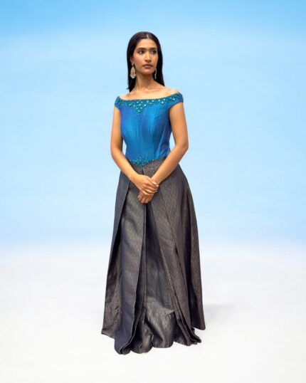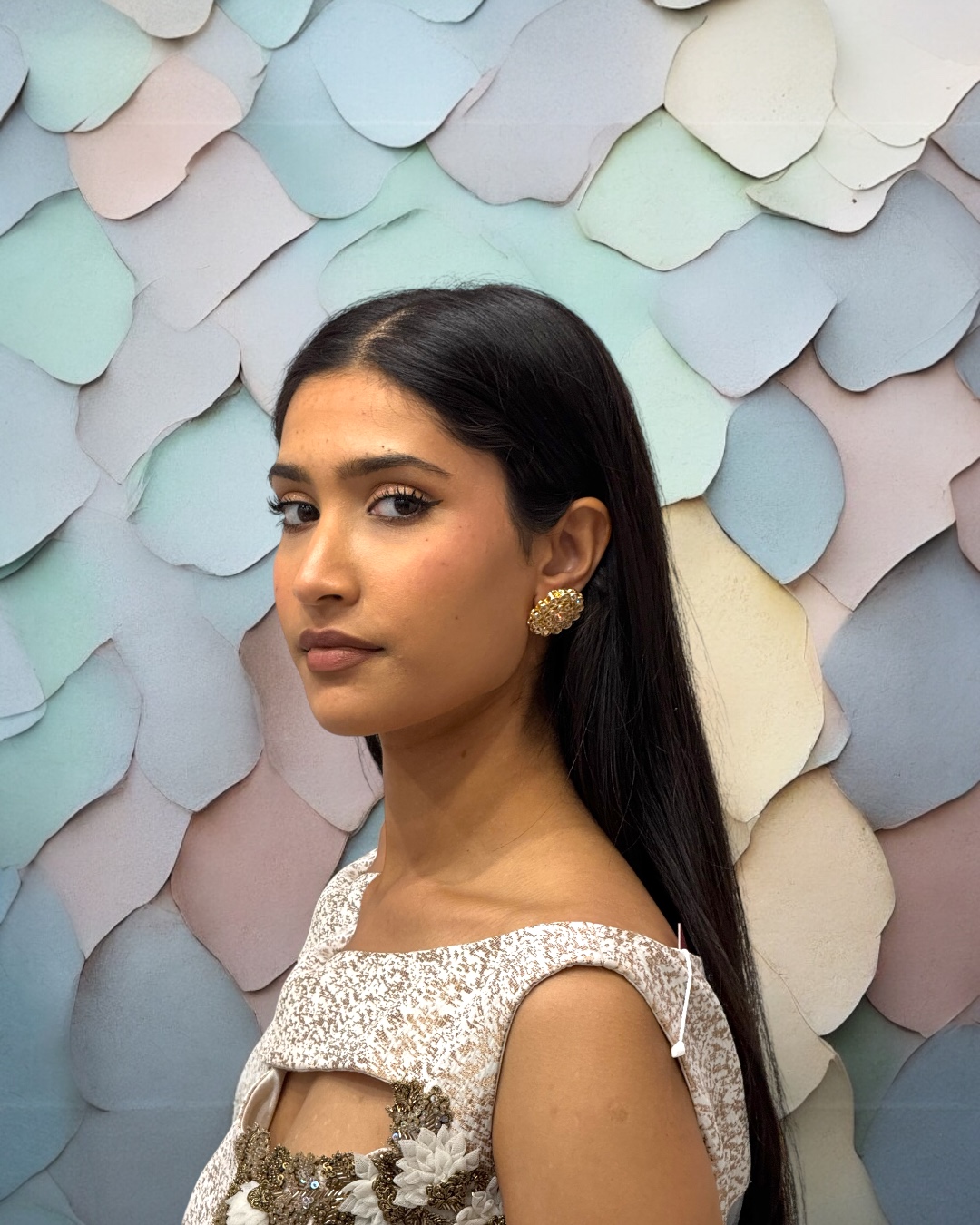 White gown with a soft silk body adorned with gold stone work, paired with a soft net lower for an elegant and modern look.