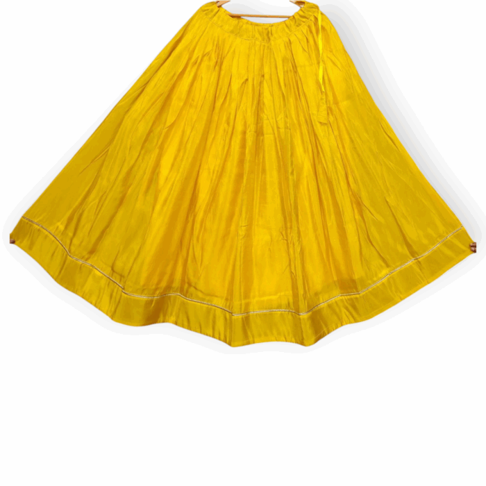 A vibrant yellow skirt crafted from soft shimmer fabric, designed with a full flare for graceful movement and an eye-catching finish.